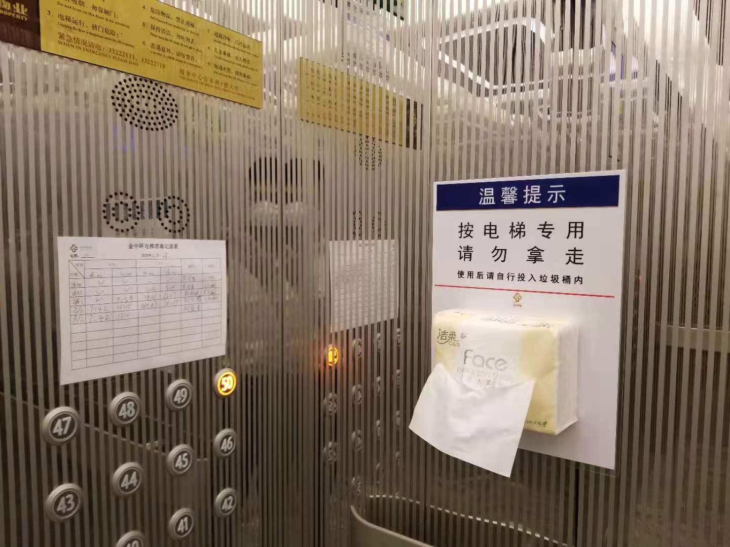 3.電(diàn)梯廳內(nèi)增設電(diàn)梯按鈕專$§✘用(yòng)紙(zhǐ)巾,方便客戶取用(yòng),減§¶少(shǎo)交叉感染途徑